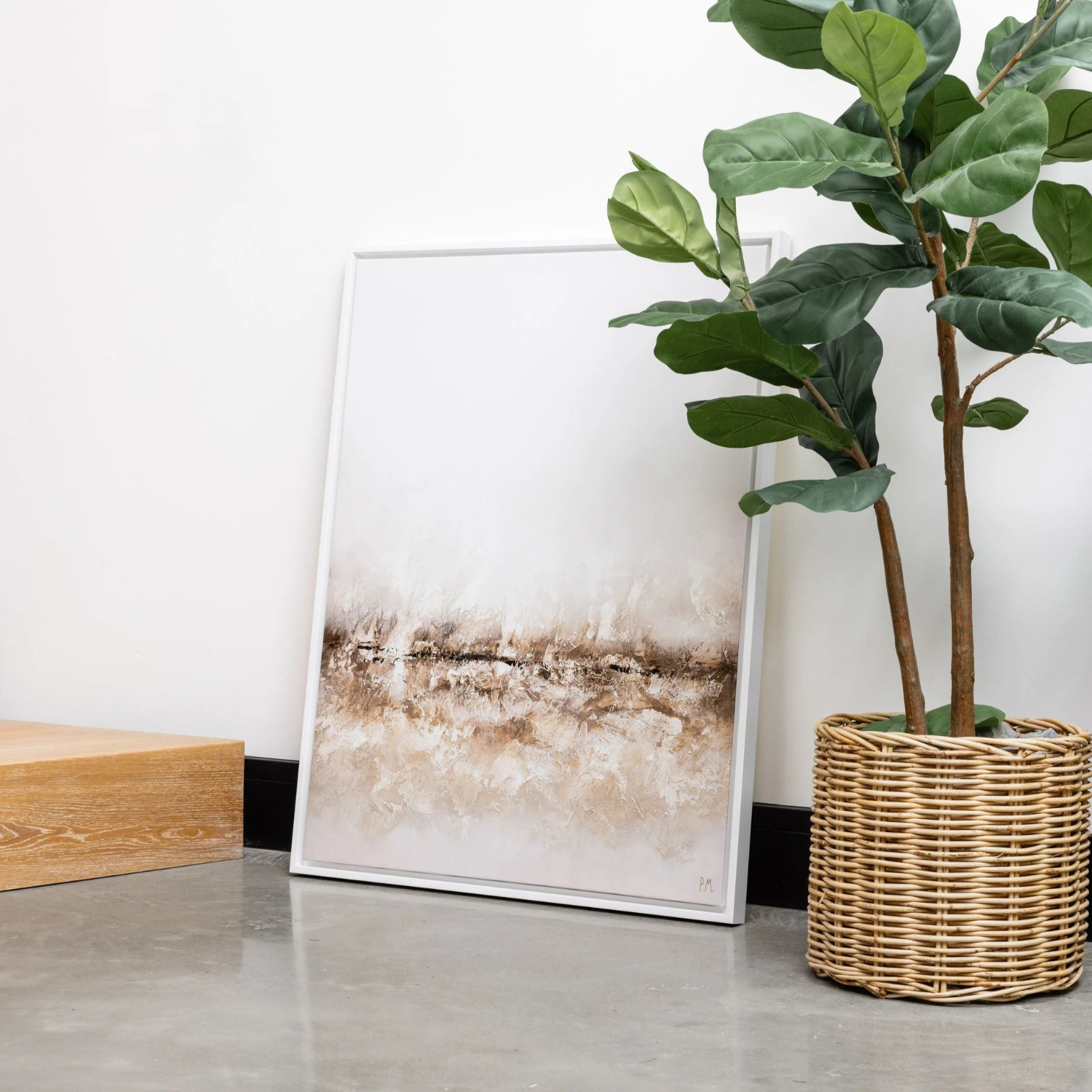 Each piece is professionally stretched and set within a sleek wooden float frame that enhances the artwork without overpowering it. The frame’s minimal profile is designed to complement a wide range of interiors.